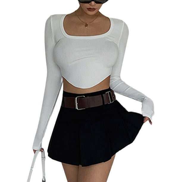 Thefound Women Stretchy Square Neck Irregular Hem Solid Color Pullover Long Sleeve Crop Top Slim Fitted Fashion T Shirt Tops Walmart Com